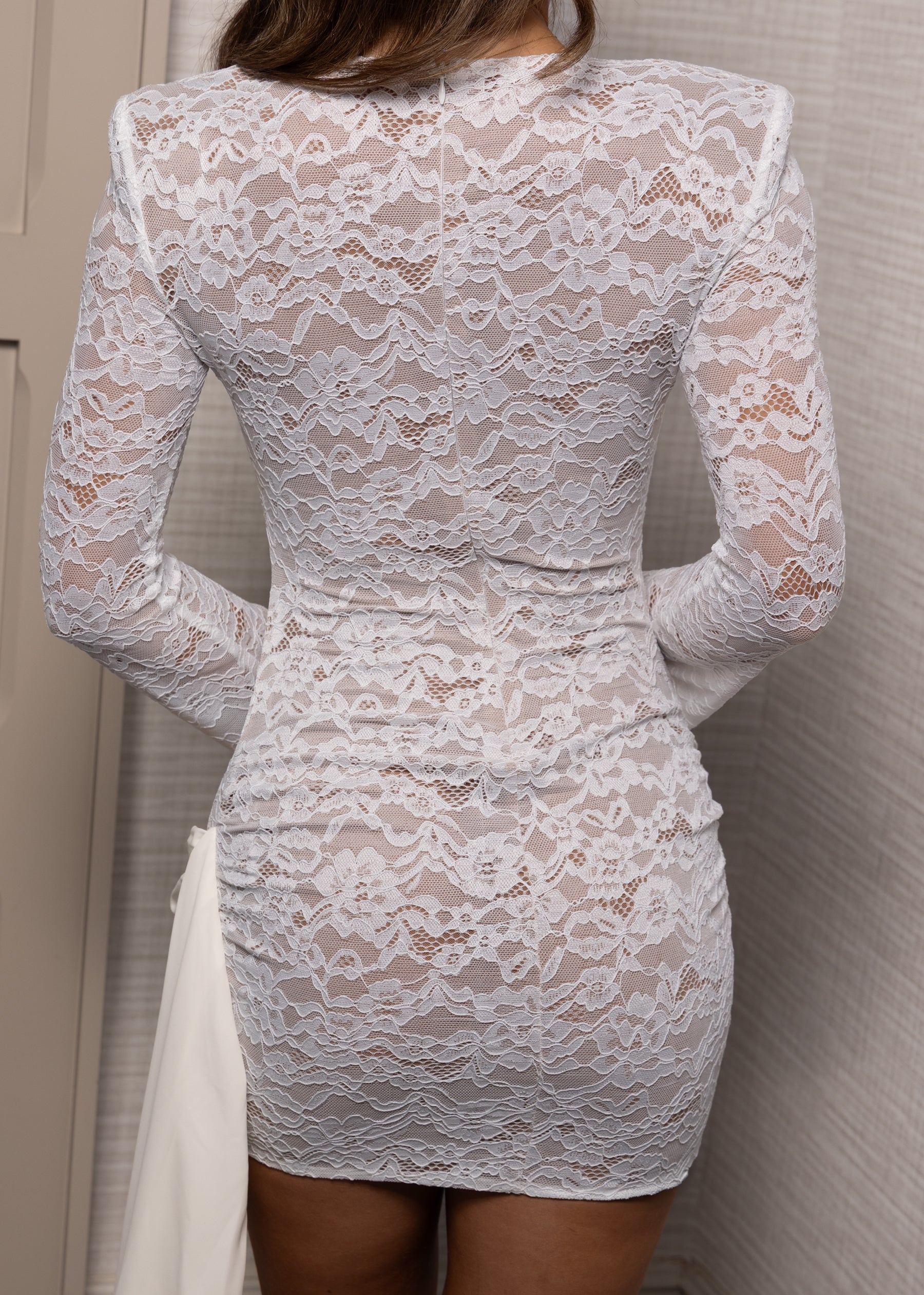 Delicate, romantic, and effortlessly captivating — Charmed Heart is a love letter to timeless femininity. This enchanting design features an intricate lace silhouette that gently contours the body, creating a look that feels both ethereal and refined. The high neckline and long lace sleeves add graceful sophistication, while the soft draped detail at the waist introduces a modern, sculpted touch. Perfect for special occasions, bridal celebrations, editorial moments, or romantic evenings.