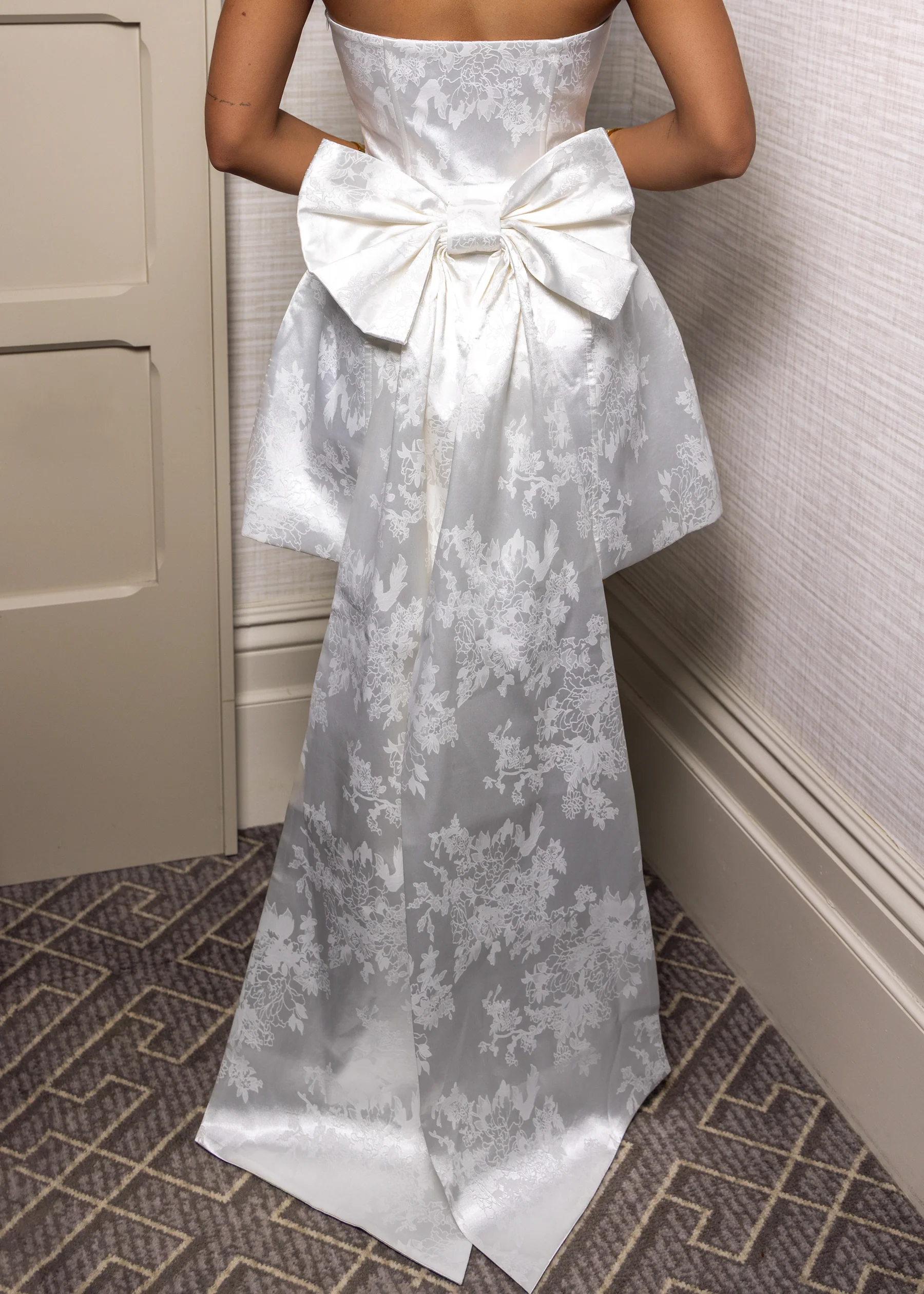 Romantic, graceful, and unforgettable — the Delicate Love Mini Dress is designed to capture hearts from every angle. The structured bodice beautifully shapes the silhouette, while the subtle jacquard fabric adds depth and dimension. The mini length keeps the look fresh and playful, perfect for celebrations, bridal events, or special evenings. At the back, the dress reveals its most captivating detail — an oversized statement bow with dramatic flowing tails that cascade to the floor, creating a stunning contrast to the sleek front. This elegant feature adds movement, romance, and a memorable finishing touch. Perfect for bridal events, birthdays and those moments where you want to embody love.