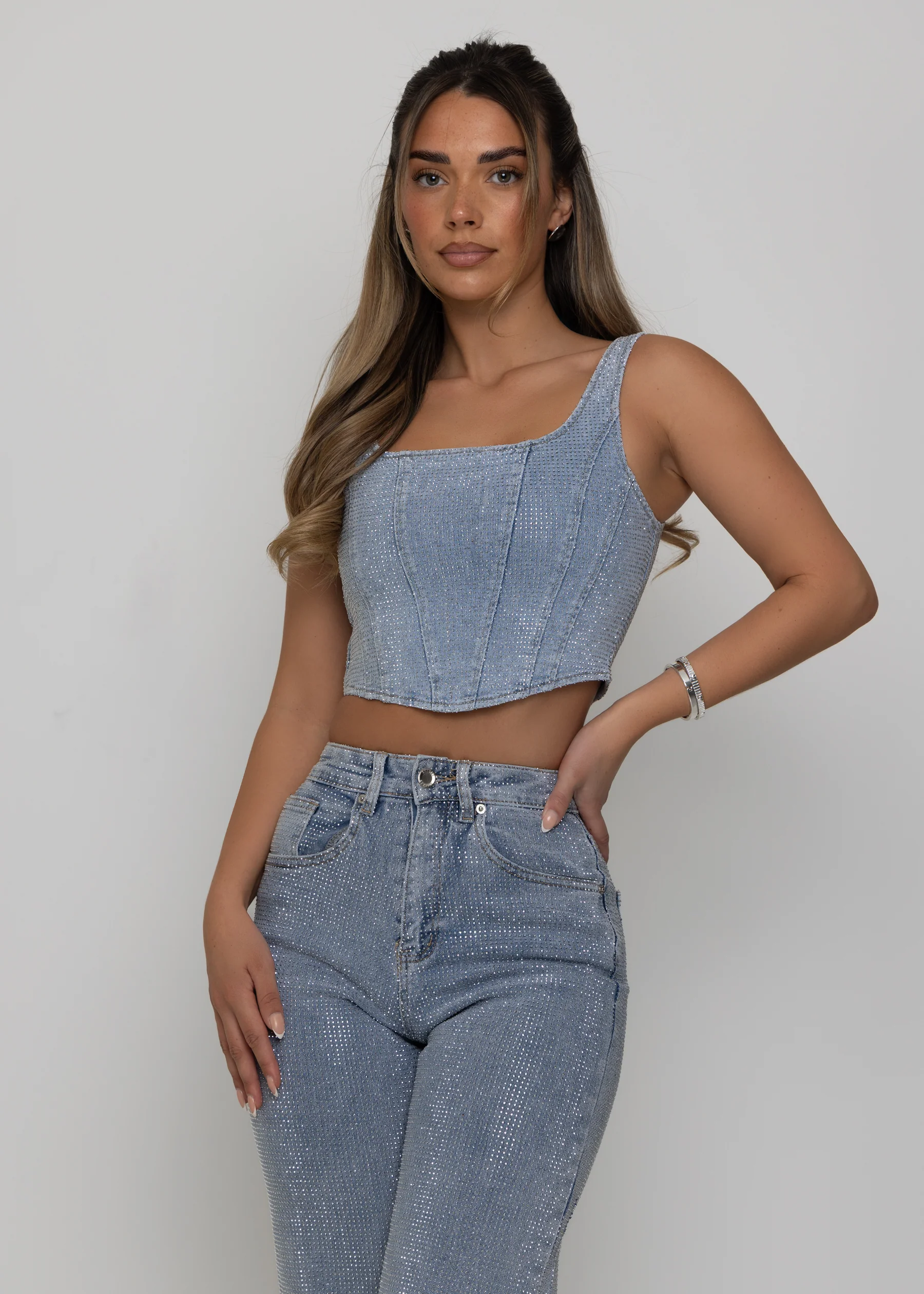 For the ultimate coordinated moment, pair with the matching Forever Sparkle denim corset top for a complete, high-impact ensemble.