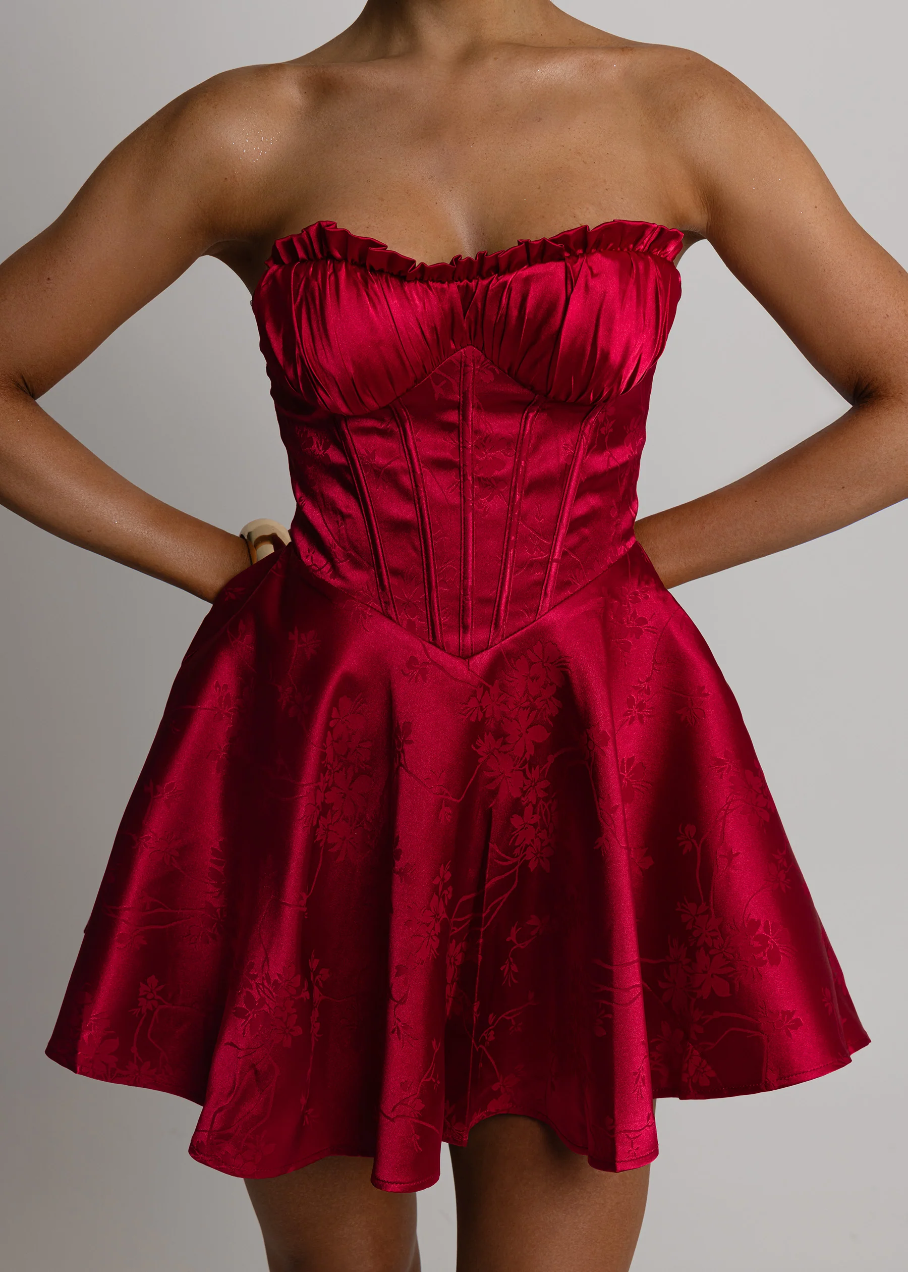 Be ready to turn heads and break hearts with our 'Heartstopper' Red Mini Dress. Featuring luxurious satin jacquard and ruched cups, this satin mini dress will leave you feeling confident and fabulous. The strapless design adds a touch of elegance, perfect for any special occasion.